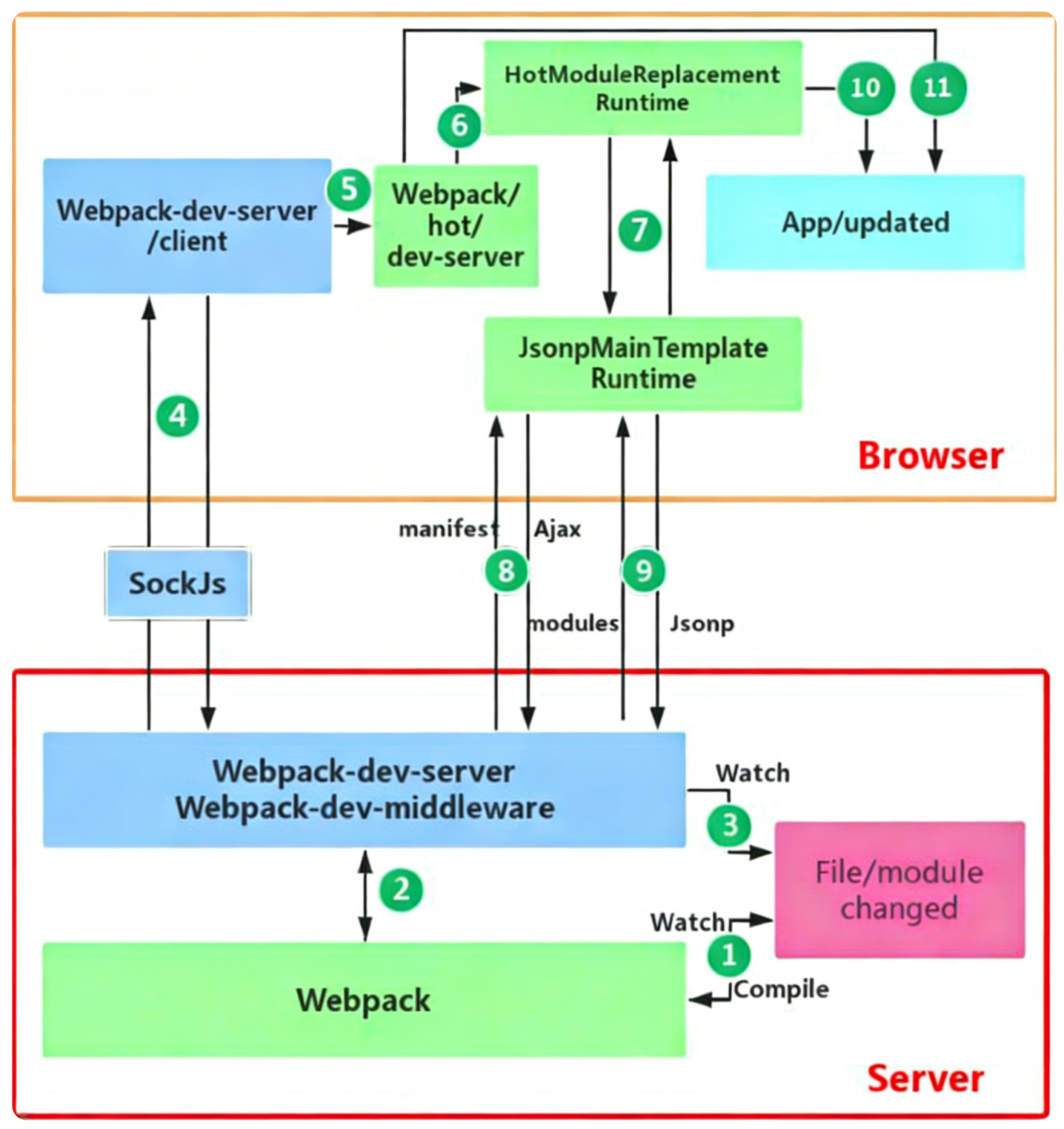 - HotModuleReplacement.runtime 是客户端 HMR 的中枢,它接收到上⼀步传递给他的新模块的 hash 值,它通过JsonpMainTemplate.runtime 向 server 端发送 Ajax 请求,服务端返回⼀个 json,该 json 包含了所有要更新的模块的 hash 值,获取到更新列表后,该模块再次通过 jsonp 请求,获取到最新的模块代码。这就是上图中 7、8、9 步骤。